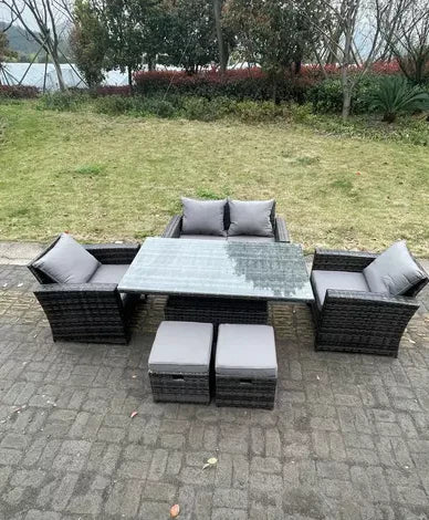 Introducing our exquisite 6 Seater London Rattan Outdoor Furniture Dining Table Set, a perfect blend of style and functionality designed to enhance your patio or garden space. Crafted with utmost care, this deluxe dining set boasts high-quality PE rattan and a durable galvanized steel construction, ensuring sturdiness and long-lasting durability.